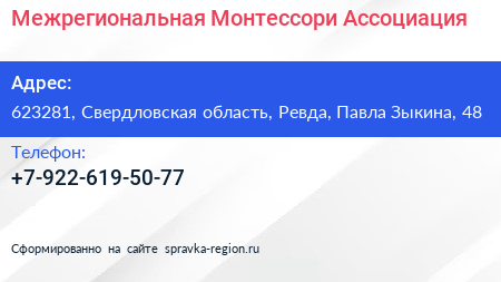 Межрегиональная Монтессори Ассоциация по адресу 623281, Свердловская область, Ревда, Павла Зыкина, 48 в дальнейшем Организация, размещена в следующих категориях: