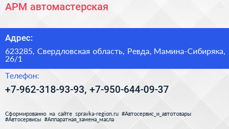 АРМ, автомастерская по адресу 623285, Свердловская область, Ревда, Мамина-Сибиряка, 26/1 в дальнейшем Организация, размещена в следующих категориях:
