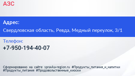 АЗС по адресу Свердловская область, Ревда, Медный переулок, 3/1 в дальнейшем Организация, размещена в следующих категориях: