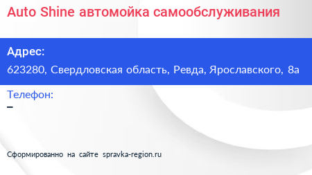 Auto Shine, автомойка самообслуживания по адресу 623280, Свердловская область, Ревда, Ярославского, 8а в дальнейшем Организация, размещена в следующих категориях: