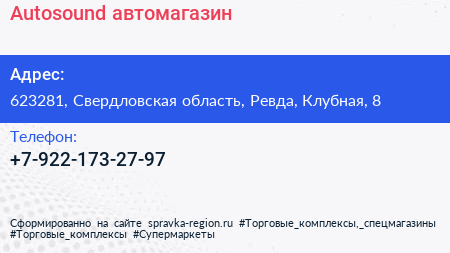 Autosound, автомагазин по адресу 623281, Свердловская область, Ревда, Клубная, 8 в дальнейшем Организация, размещена в следующих категориях: