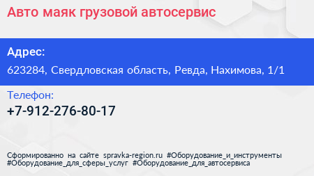 Авто маяк, грузовой автосервис по адресу 623284, Свердловская область, Ревда, Нахимова, 1/1 в дальнейшем Организация, размещена в следующих категориях: