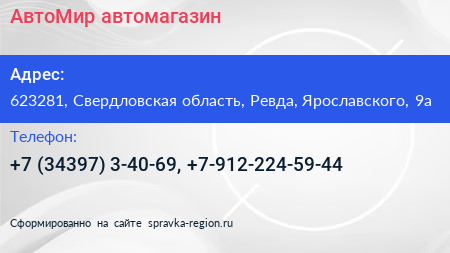 АвтоМир, автомагазин по адресу 623281, Свердловская область, Ревда, Ярославского, 9а в дальнейшем Организация, размещена в следующих категориях: