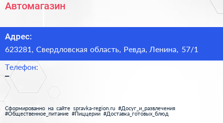 Автомагазин по адресу 623281, Свердловская область, Ревда, Ленина, 57/1 в дальнейшем Организация, размещена в следующих категориях: