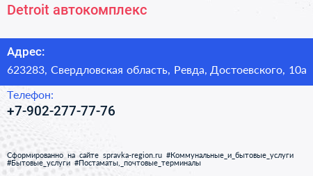 Detroit, автокомплекс по адресу 623283, Свердловская область, Ревда, Достоевского, 10а в дальнейшем Организация, размещена в следующих категориях: