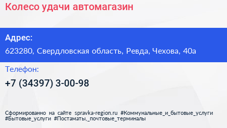 Колесо удачи, автомагазин по адресу 623280, Свердловская область, Ревда, Чехова, 40а в дальнейшем Организация, размещена в следующих категориях: