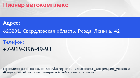 Пионер, автокомплекс по адресу 623281, Свердловская область, Ревда, Ленина, 42 в дальнейшем Организация, размещена в следующих категориях: