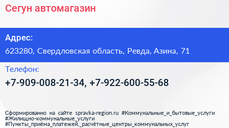 Сегун, автомагазин по адресу 623280, Свердловская область, Ревда, Азина, 71 в дальнейшем Организация, размещена в следующих категориях: