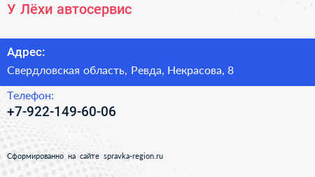 У Лёхи, автосервис по адресу Свердловская область, Ревда, Некрасова, 8 в дальнейшем Организация, размещена в следующих категориях: