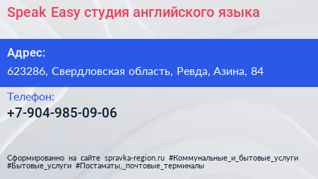 Speak Easy, студия английского языка по адресу 623286, Свердловская область, Ревда, Азина, 84 в дальнейшем Организация, размещена в следующих категориях: