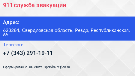 911, служба эвакуации по адресу 623284, Свердловская область, Ревда, Республиканская, 65 в дальнейшем Организация, размещена в следующих категориях: