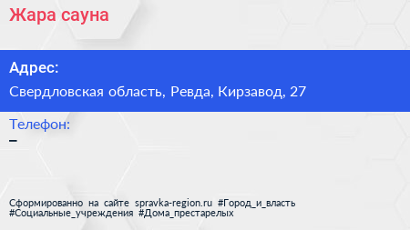 Жара, сауна по адресу Свердловская область, Ревда, Кирзавод, 27 в дальнейшем Организация, размещена в следующих категориях: