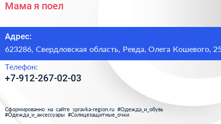 Мама, я поел по адресу 623286, Свердловская область, Ревда, Олега Кошевого, 25 в дальнейшем Организация, размещена в следующих категориях: