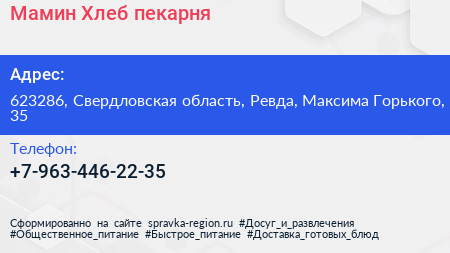 Мамин Хлеб, пекарня по адресу 623286, Свердловская область, Ревда, Максима Горького, 35 в дальнейшем Организация, размещена в следующих категориях: