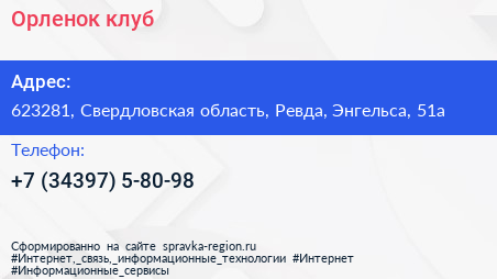 Орленок, клуб по адресу 623281, Свердловская область, Ревда, Энгельса, 51а в дальнейшем Организация, размещена в следующих категориях: