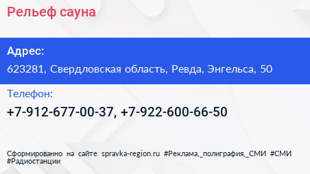 Рельеф, сауна по адресу 623281, Свердловская область, Ревда, Энгельса, 50 в дальнейшем Организация, размещена в следующих категориях: