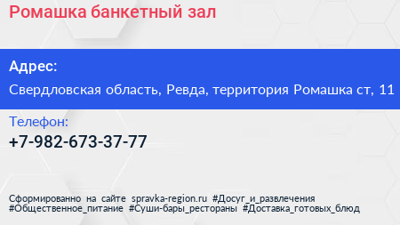 Ромашка, банкетный зал по адресу Свердловская область, Ревда, территория Ромашка ст, 11 в дальнейшем Организация, размещена в следующих категориях: