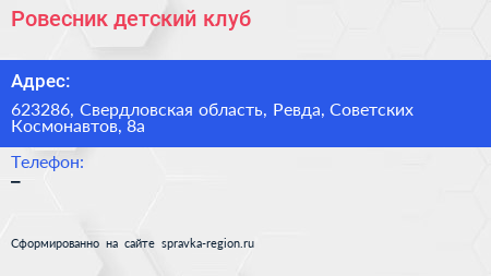Ровесник, детский клуб по адресу 623286, Свердловская область, Ревда, Советских Космонавтов, 8а в дальнейшем Организация, размещена в следующих категориях: