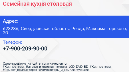 Семейная кухня, столовая по адресу 623286, Свердловская область, Ревда, Максима Горького, 30 в дальнейшем Организация, размещена в следующих категориях: