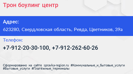 Трон, боулинг-центр по адресу 623280, Свердловская область, Ревда, Цветников, 39а в дальнейшем Организация, размещена в следующих категориях: