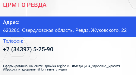 ЦРМ ГО РЕВДА по адресу 623286, Свердловская область, Ревда, Жуковского, 22 в дальнейшем Организация, размещена в следующих категориях: