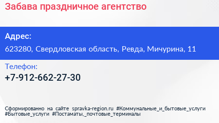 Забава, праздничное агентство по адресу 623280, Свердловская область, Ревда, Мичурина, 11 в дальнейшем Организация, размещена в следующих категориях: