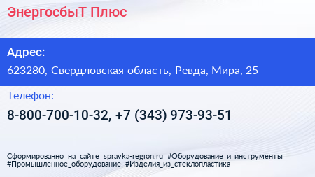 ЭнергосбыТ Плюс по адресу 623280, Свердловская область, Ревда, Мира, 25 в дальнейшем Организация, размещена в следующих категориях: