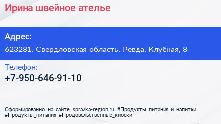 Ирина, швейное ателье по адресу 623281, Свердловская область, Ревда, Клубная, 8 в дальнейшем Организация, размещена в следующих категориях: