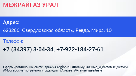 МЕЖРАЙГАЗ-УРАЛ по адресу 623286, Свердловская область, Ревда, Мира, 10 в дальнейшем Организация, размещена в следующих категориях: