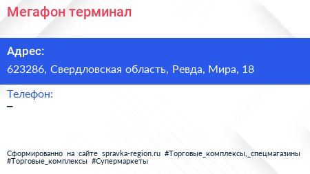 Мегафон, терминал по адресу 623286, Свердловская область, Ревда, Мира, 18 в дальнейшем Организация, размещена в следующих категориях: