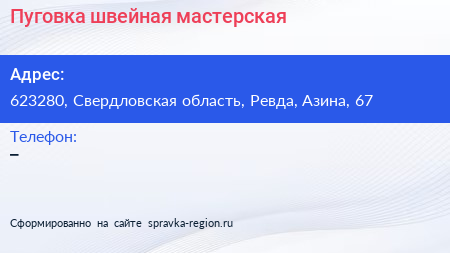 Пуговка, швейная мастерская по адресу 623280, Свердловская область, Ревда, Азина, 67 в дальнейшем Организация, размещена в следующих категориях: