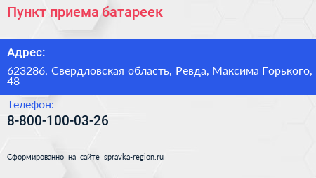 Пункт приема батареек по адресу 623286, Свердловская область, Ревда, Максима Горького, 48 в дальнейшем Организация, размещена в следующих категориях:
