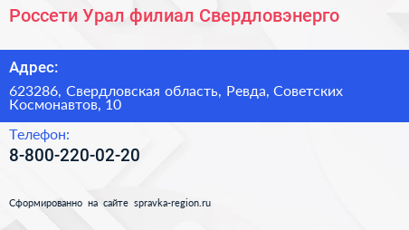 Россети Урал, филиал Свердловэнерго по адресу 623286, Свердловская область, Ревда, Советских Космонавтов, 10 в дальнейшем Организация, размещена в следующих категориях: