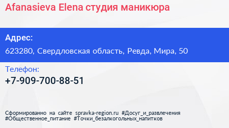 Afanasieva Elena, студия маникюра по адресу 623280, Свердловская область, Ревда, Мира, 50 в дальнейшем Организация, размещена в следующих категориях: