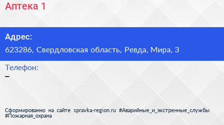 Аптека №1 по адресу 623286, Свердловская область, Ревда, Мира, 3 в дальнейшем Организация, размещена в следующих категориях: