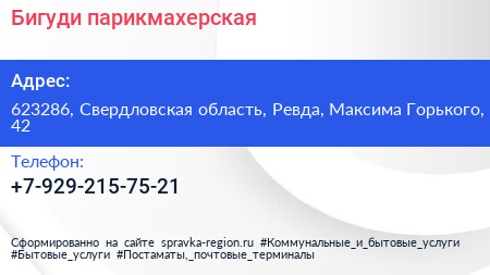 Бигуди, парикмахерская по адресу 623286, Свердловская область, Ревда, Максима Горького, 42 в дальнейшем Организация, размещена в следующих категориях: