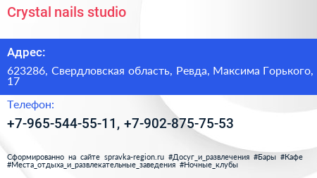 Crystal nails studio по адресу 623286, Свердловская область, Ревда, Максима Горького, 17 в дальнейшем Организация, размещена в следующих категориях: