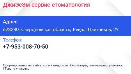 ДжиЭсЭм сервис, стоматология по адресу 623280, Свердловская область, Ревда, Цветников, 29 в дальнейшем Организация, размещена в следующих категориях: