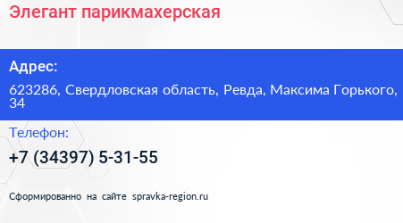 Элегант, парикмахерская по адресу 623286, Свердловская область, Ревда, Максима Горького, 34 в дальнейшем Организация, размещена в следующих категориях: