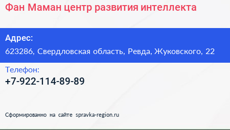 Фан Маман, центр развития интеллекта по адресу 623286, Свердловская область, Ревда, Жуковского, 22 в дальнейшем Организация, размещена в следующих категориях: