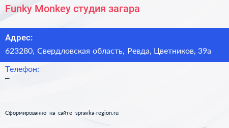 Funky Monkey, студия загара по адресу 623280, Свердловская область, Ревда, Цветников, 39а в дальнейшем Организация, размещена в следующих категориях: