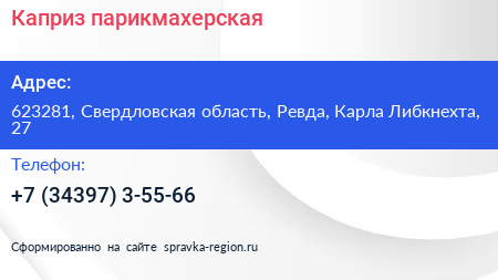Каприз, парикмахерская по адресу 623281, Свердловская область, Ревда, Карла Либкнехта, 27 в дальнейшем Организация, размещена в следующих категориях: