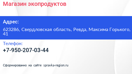 Магазин экопродуктов по адресу 623286, Свердловская область, Ревда, Максима Горького, 41 в дальнейшем Организация, размещена в следующих категориях:
