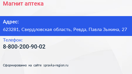 Магнит, аптека по адресу 623281, Свердловская область, Ревда, Павла Зыкина, 27 в дальнейшем Организация, размещена в следующих категориях: