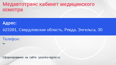 Медавтотранс, кабинет медицинского осмотра по адресу 623281, Свердловская область, Ревда, Энгельса, 30 в дальнейшем Организация, размещена в следующих категориях:
