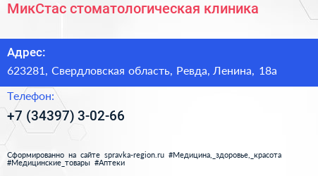 МикСтас, стоматологическая клиника по адресу 623281, Свердловская область, Ревда, Ленина, 18а в дальнейшем Организация, размещена в следующих категориях: