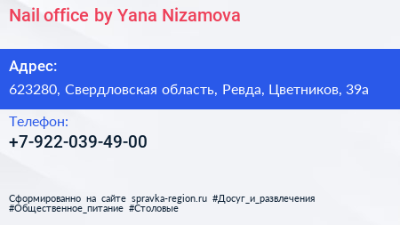 Nail office by Yana Nizamova по адресу 623280, Свердловская область, Ревда, Цветников, 39а в дальнейшем Организация, размещена в следующих категориях: