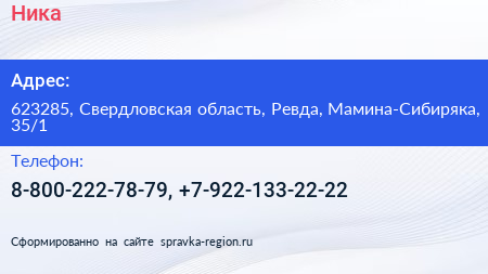 Ника по адресу 623285, Свердловская область, Ревда, Мамина-Сибиряка, 35/1 в дальнейшем Организация, размещена в следующих категориях: