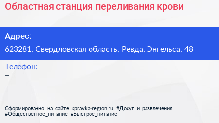 Областная станция переливания крови по адресу 623281, Свердловская область, Ревда, Энгельса, 48 в дальнейшем Организация, размещена в следующих категориях: