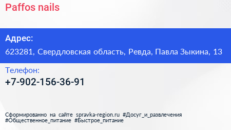 Paffos-nails по адресу 623281, Свердловская область, Ревда, Павла Зыкина, 13 в дальнейшем Организация, размещена в следующих категориях: